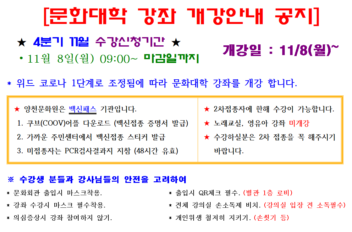 ※ 노래교실, 영유아강좌(잼재미, 도자교실) 강좌는 개강을 연기 합니다.