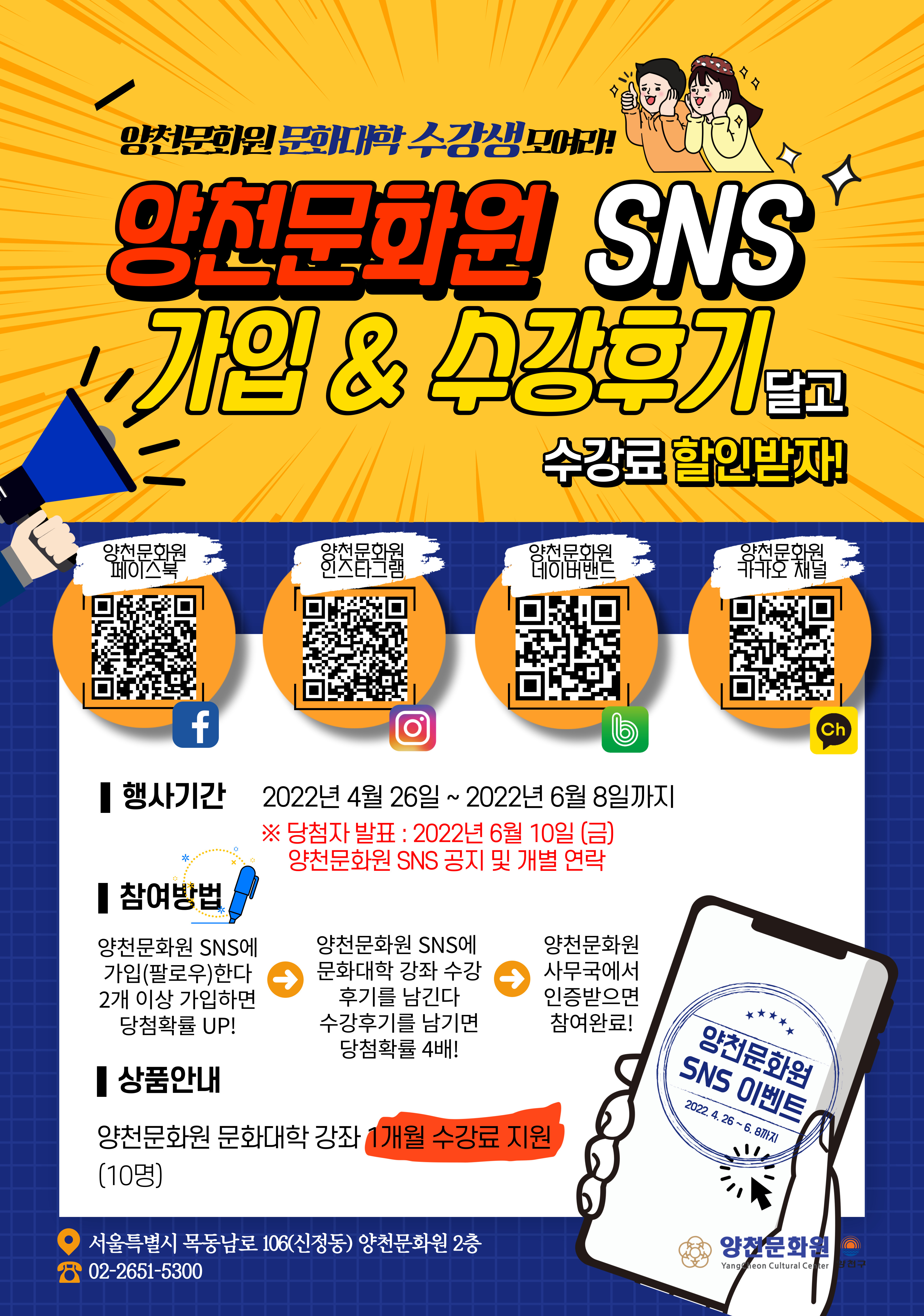 양천문화원 SNS 가입(팔로우) & 수강후기를 남겨주시면 문화대학 강좌 <1개월 수강료를 지원>해드리는 특별 이벤트 입니다.