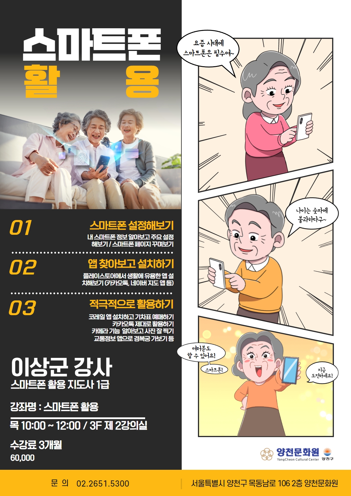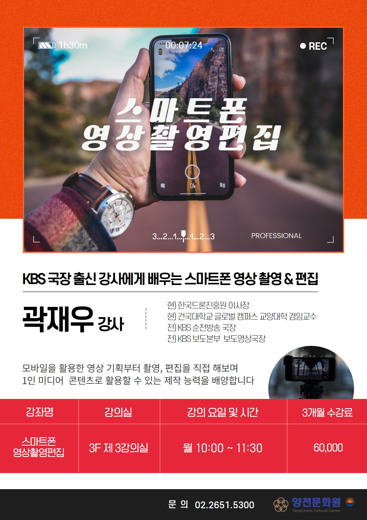양천문화원은 시니어를 위한 「스마트폰 활용」부터 「스마트폰 영상촬영 편집」, 미술 심화과정인 「창의미술작품」까지 구민, 회원 여러분의 의견을 수렴하여 3분기 신규강좌를 추가개설 하였습니다.