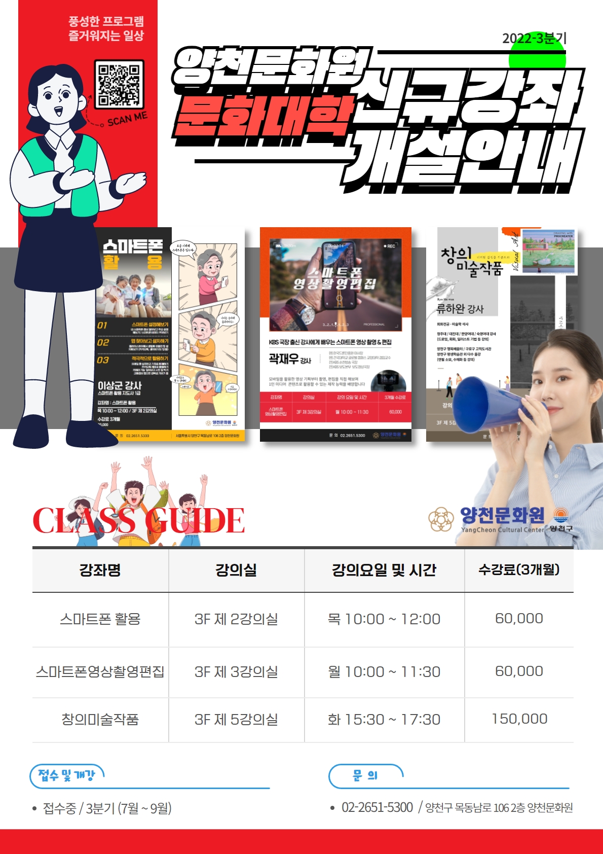 양천문화원은 시니어를 위한 「스마트폰 활용」부터 「스마트폰 영상촬영 편집」, 미술 심화과정인 「창의미술작품」까지 구민, 회원 여러분의 의견을 수렴하여 3분기 신규강좌를 추가개설 하였습니다.
