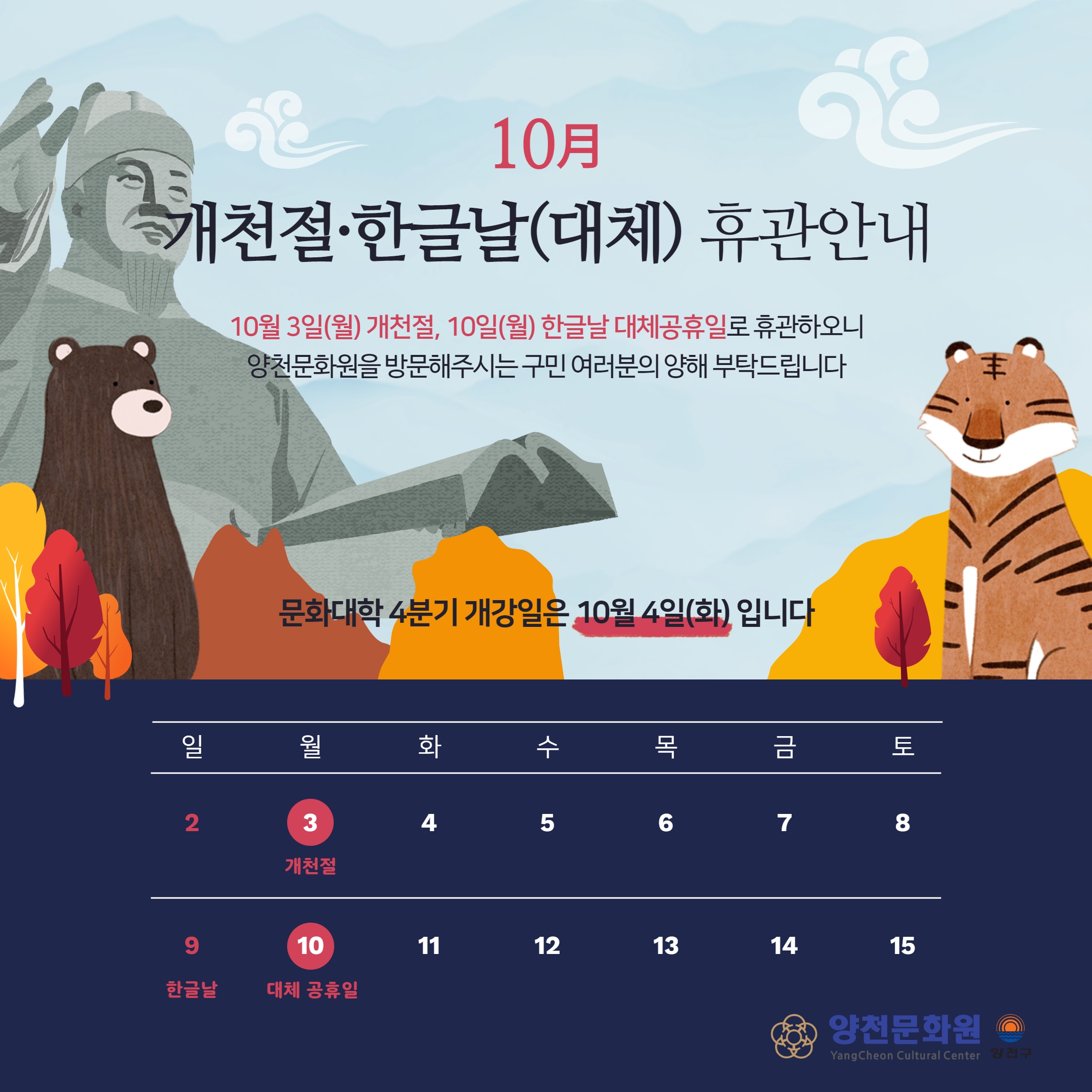 #양천문화원 #개천절 #한글날 #대체공휴일 #휴관일 #방문 #가을 #정취 #계절 #국가공휴일 #애국심 #한글 #세종대왕 #단군 #호랑이 #곰 #설화