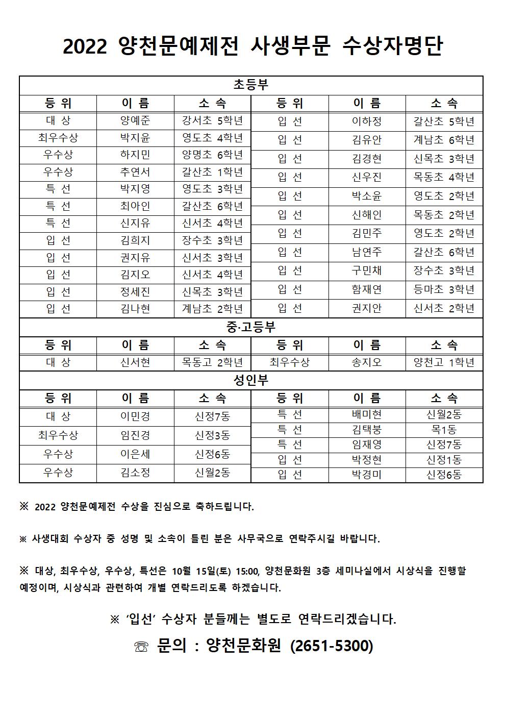 백일장, 사생, 휘호 부문의 수상자를 발표하오니 확인을 부탁드리며, 수상을 진심으로 축하드립니다.