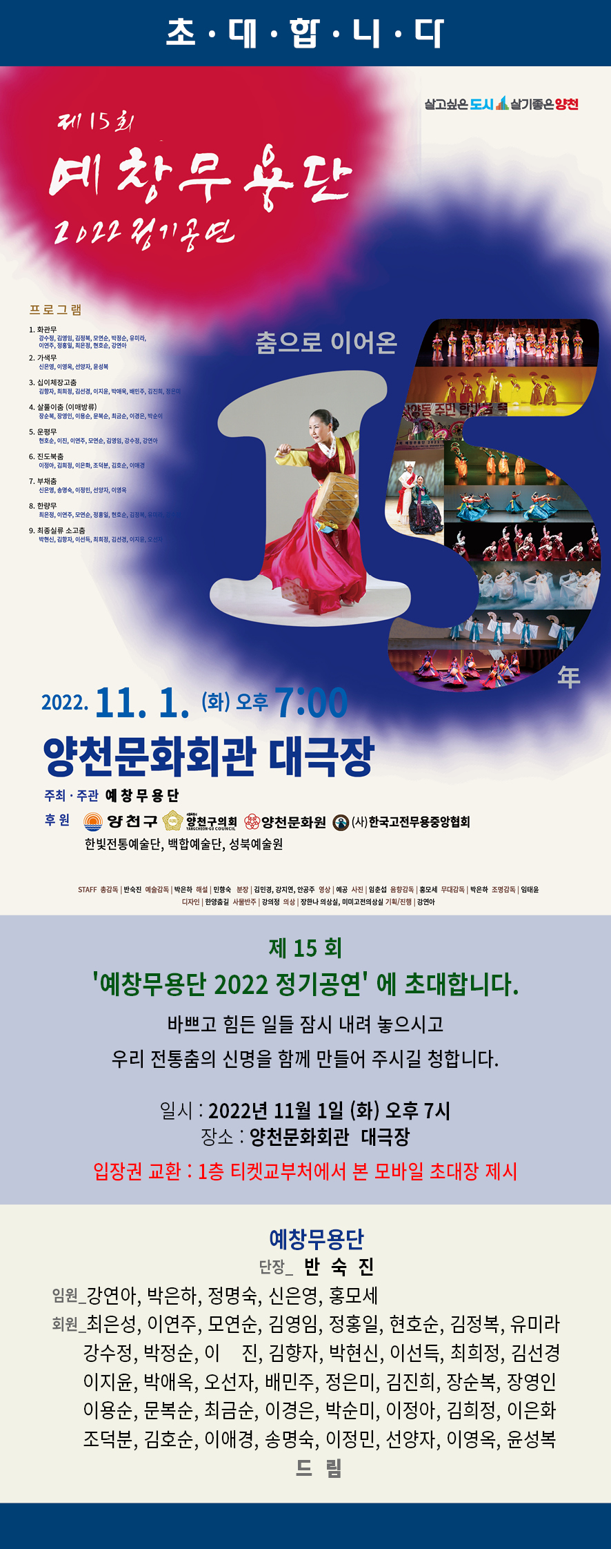 한국무용의 예술적 춤사위를 만나볼 수 있는 「제 15회 예창공연단 정기공연」을 안내드립니다.