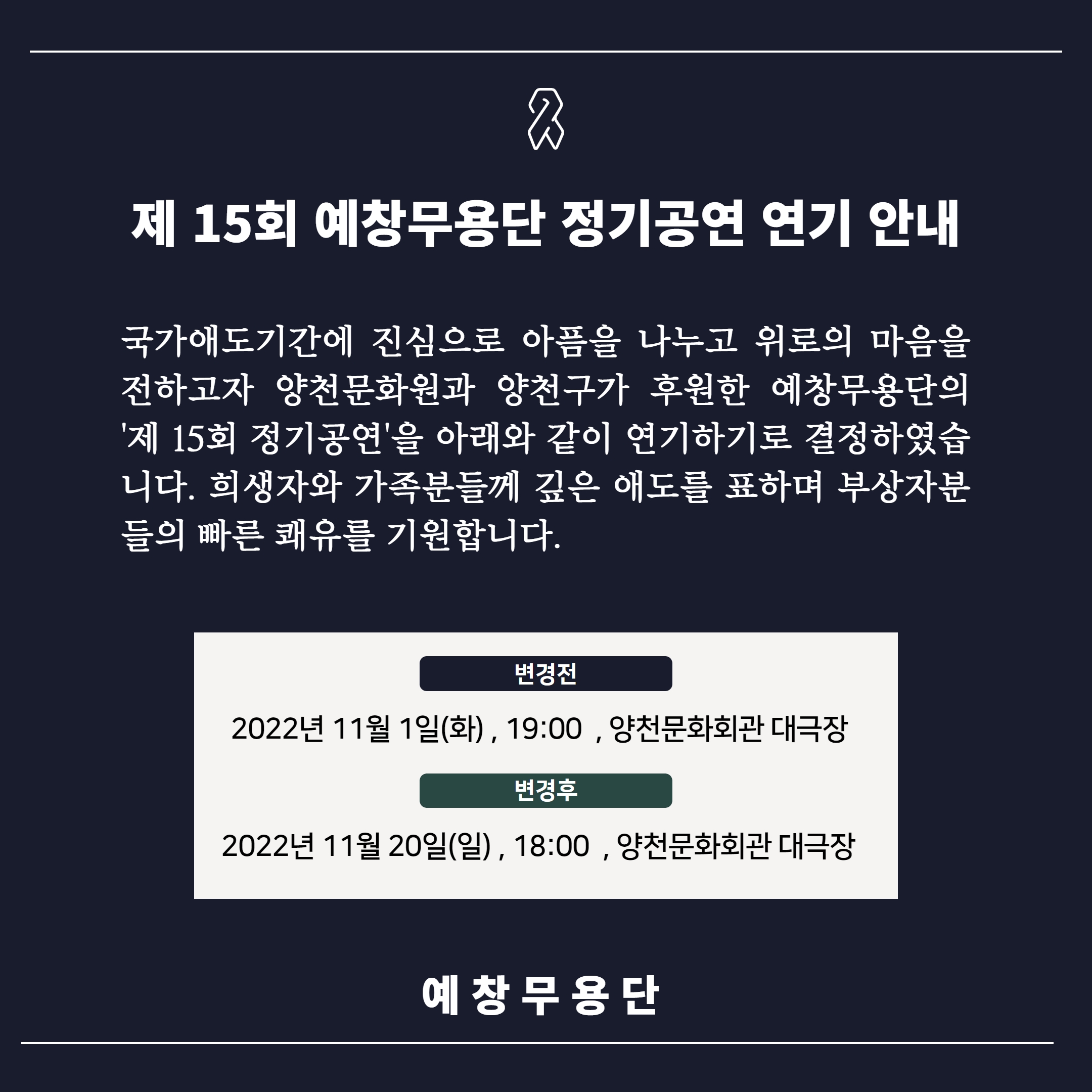 | 펠리체윈드오케스트라(양천문화원 서포터즈) 공연 연기 안내 (0) | 2022.11.01 |