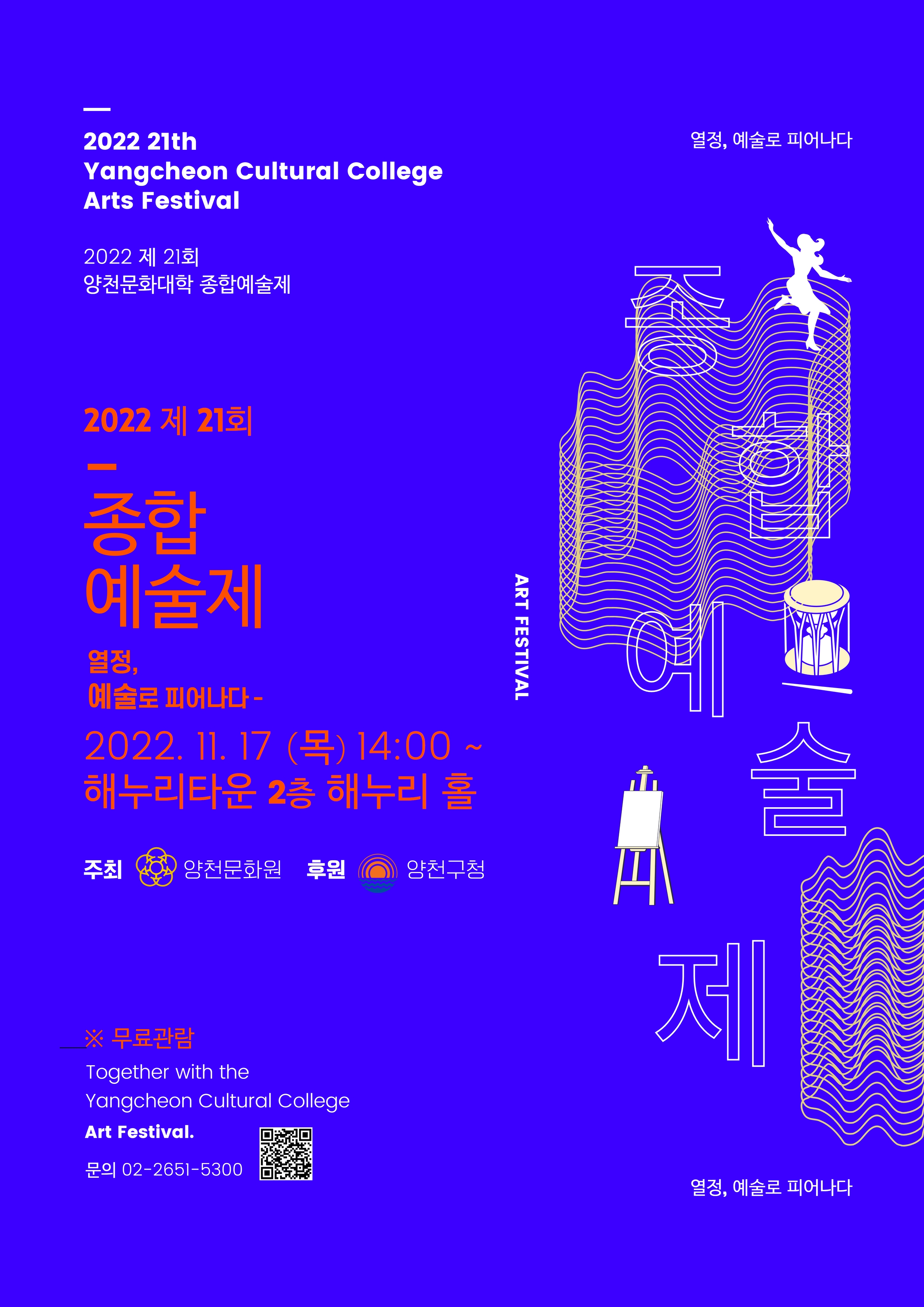 ‘2022 제21회 양천문화대학 종합예술제(열정, 예술로 피어나다)’는 지역 문화예술 활성화 일환으로 양천문화원이 주최하고 양천구청의 후원으로 마련되었습니다.