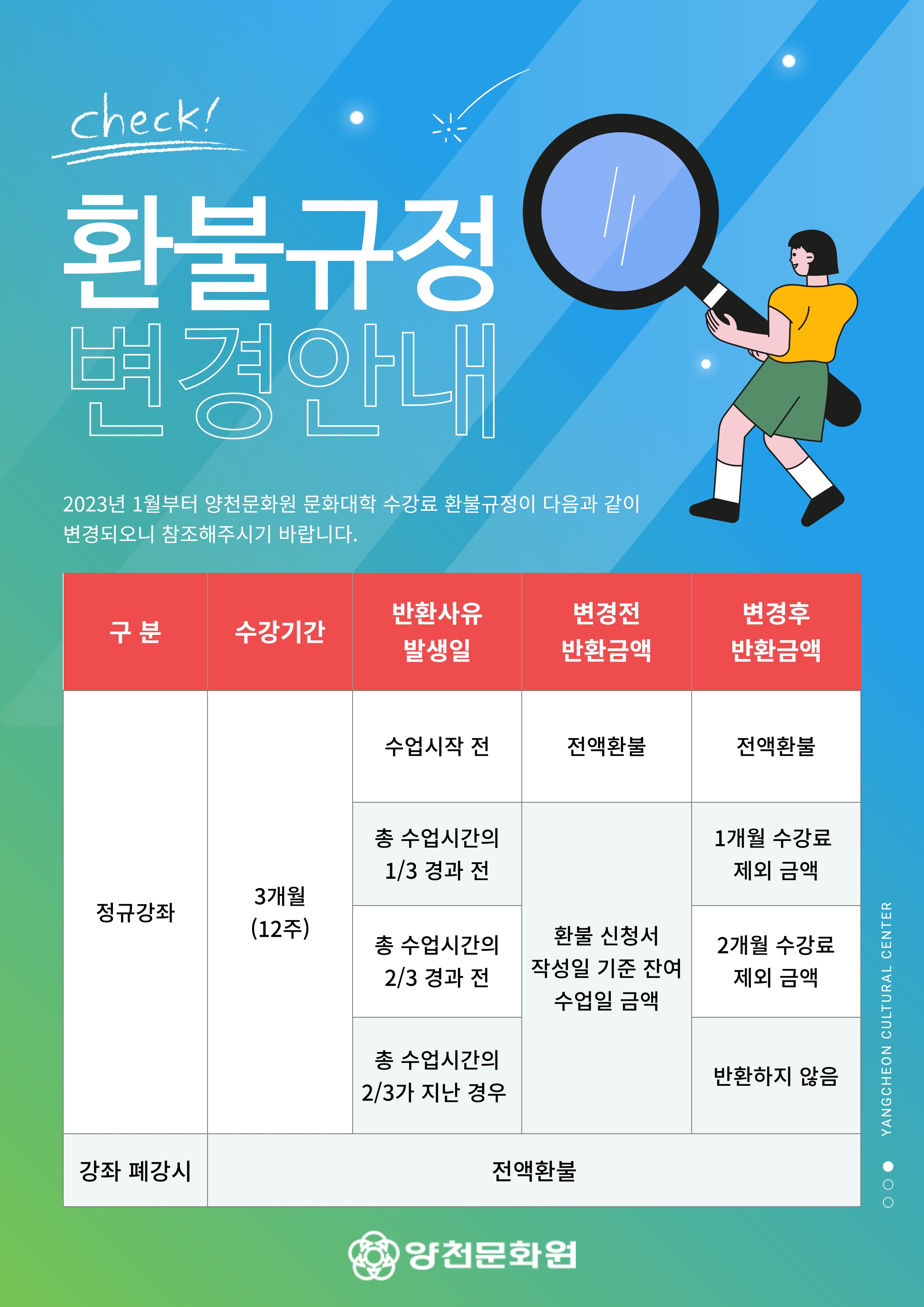 양천문화원 문화대학 2023년 1분기(1-3월) 접수 일정과 함께, 1월부터 변경되는 환불규정을 안내드리오니 참조해주시기 바랍니다!