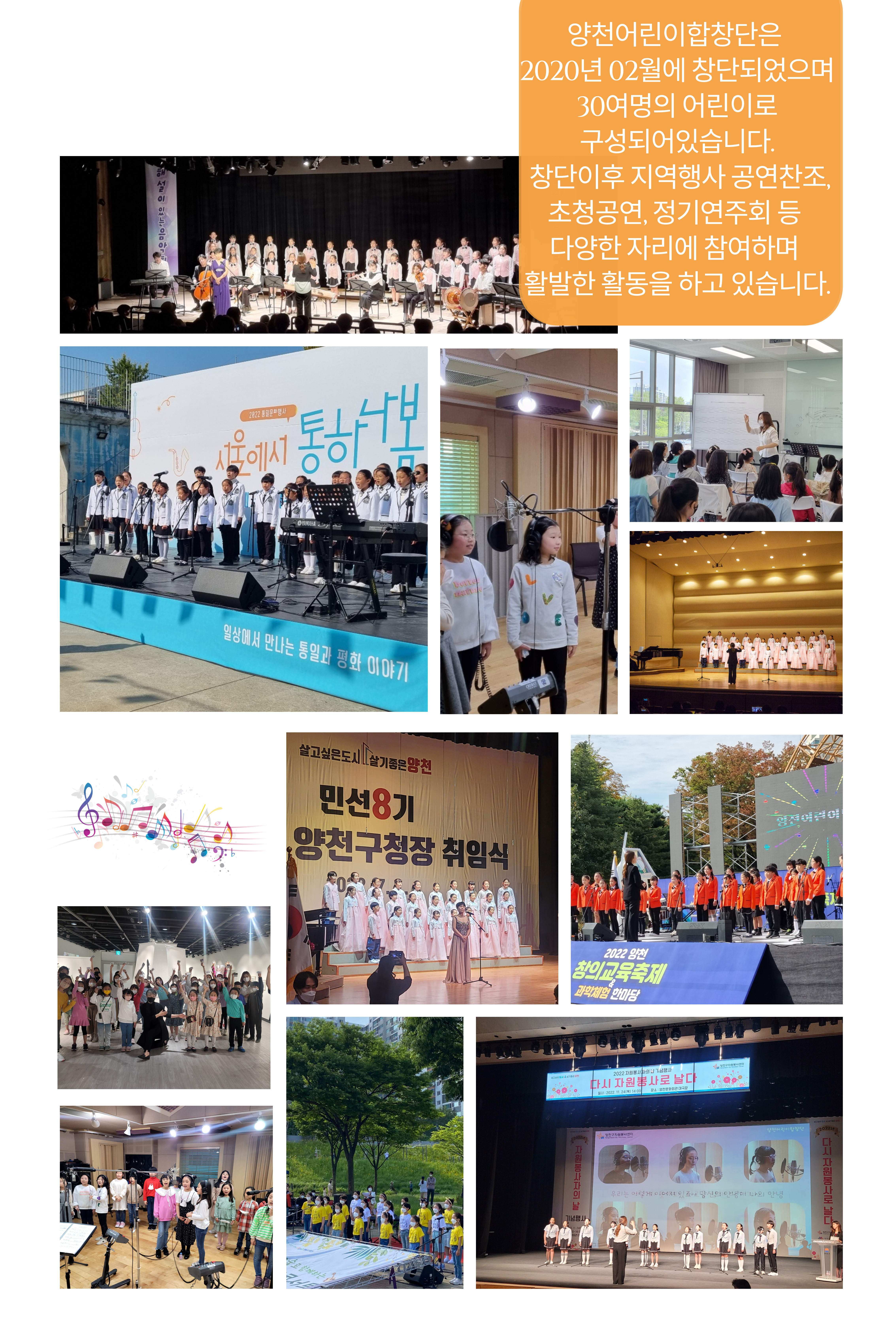 양천어린이합창단은 2020년 01월에 창단되었으며 30여명의 어린이(초1~중1)로 구성되어있습니다. 창단이후 지역행사 공연찬조, 초청공연, 정기연주회 등 다양한 자리에 참여하며 활발한 활동을 하고 있습니다.