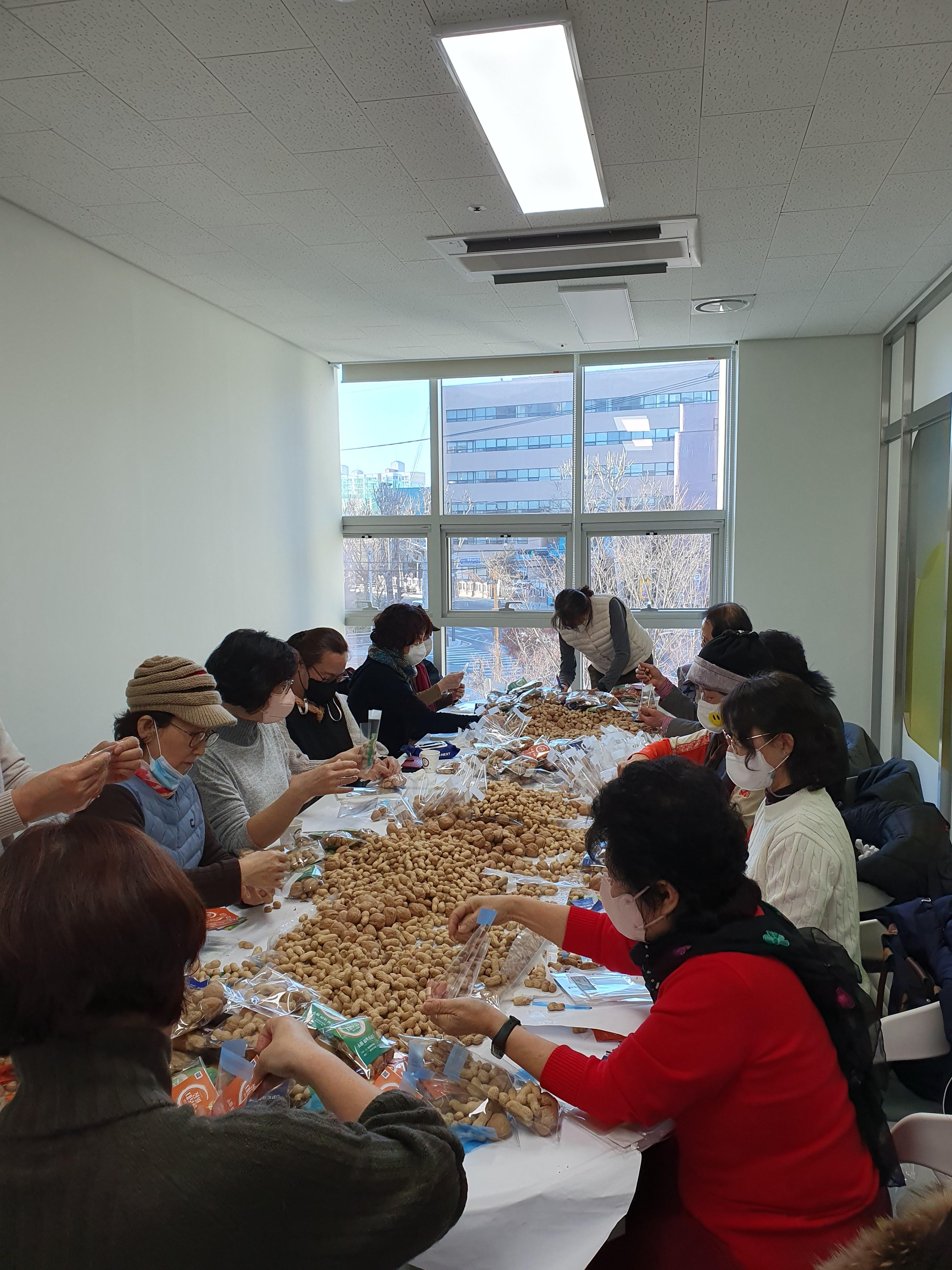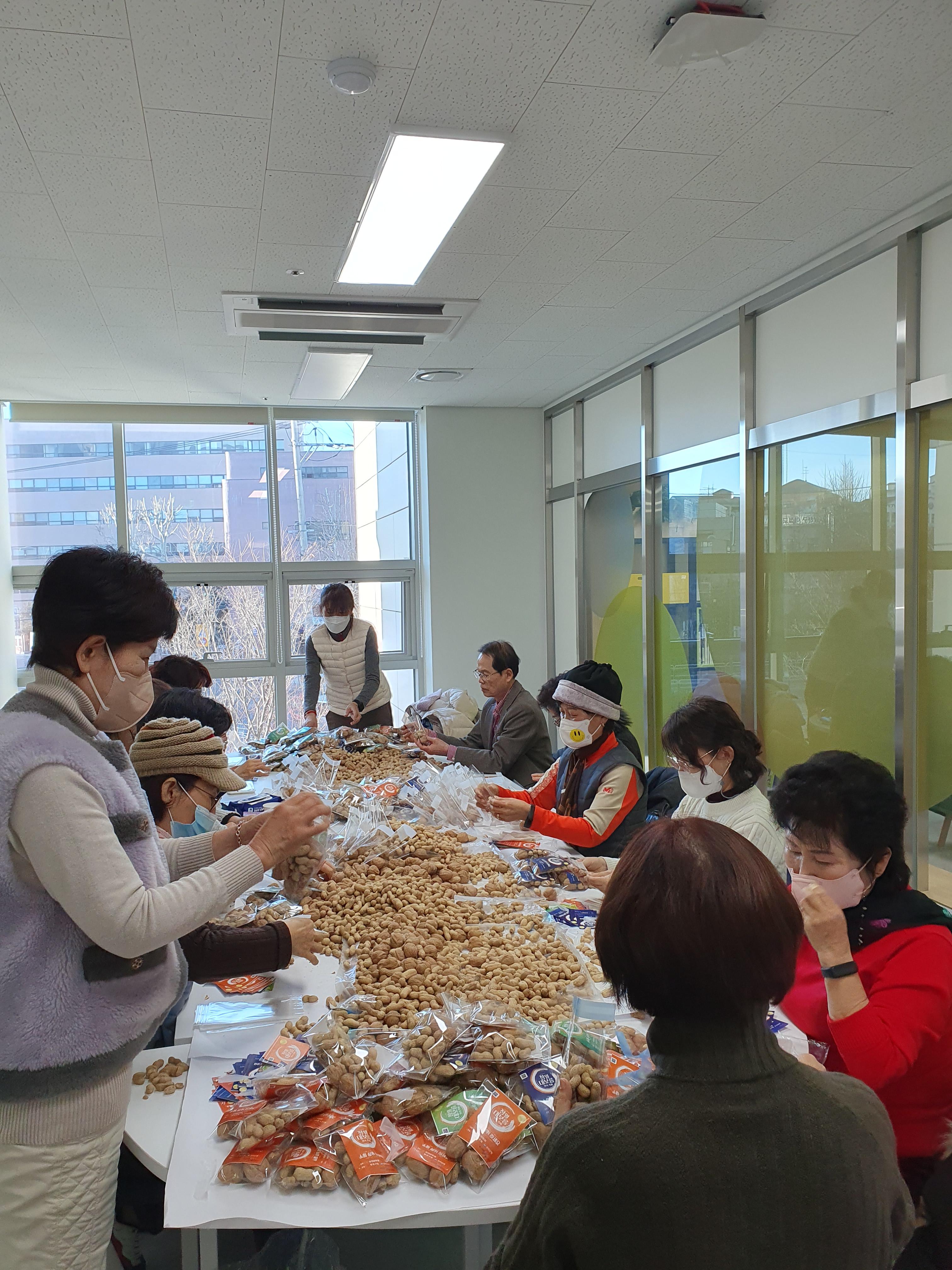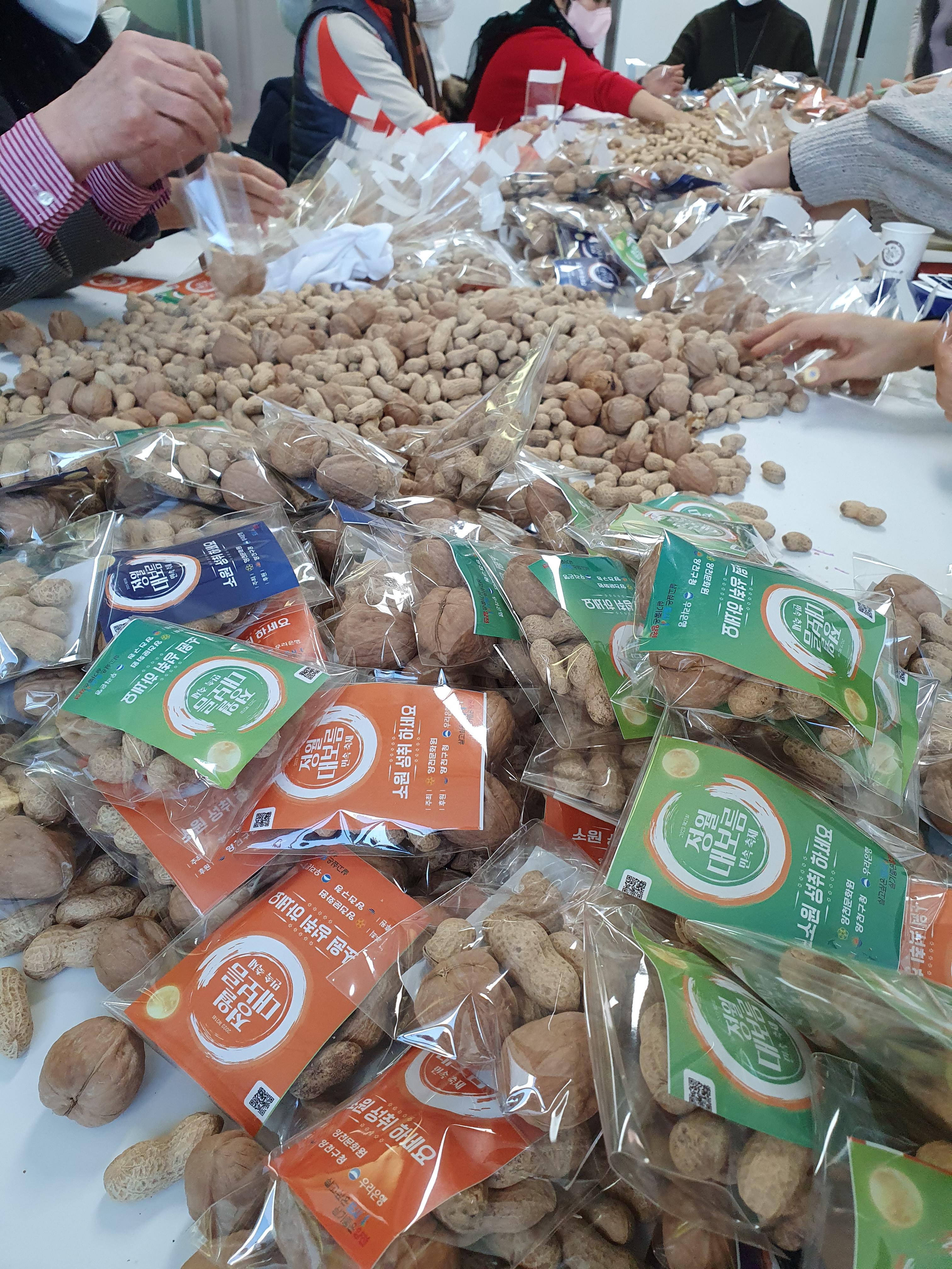 양천구에서 활동하는 봉사단체로, 어르신과 이웃에게 웃음을 선사하는 <하하 봉사단>과 함께 축제에서 나눠드릴 부럼을 포장하고 있습니다. 부럼을 포장하는 손길에서 정성이 가득 느껴집니다.