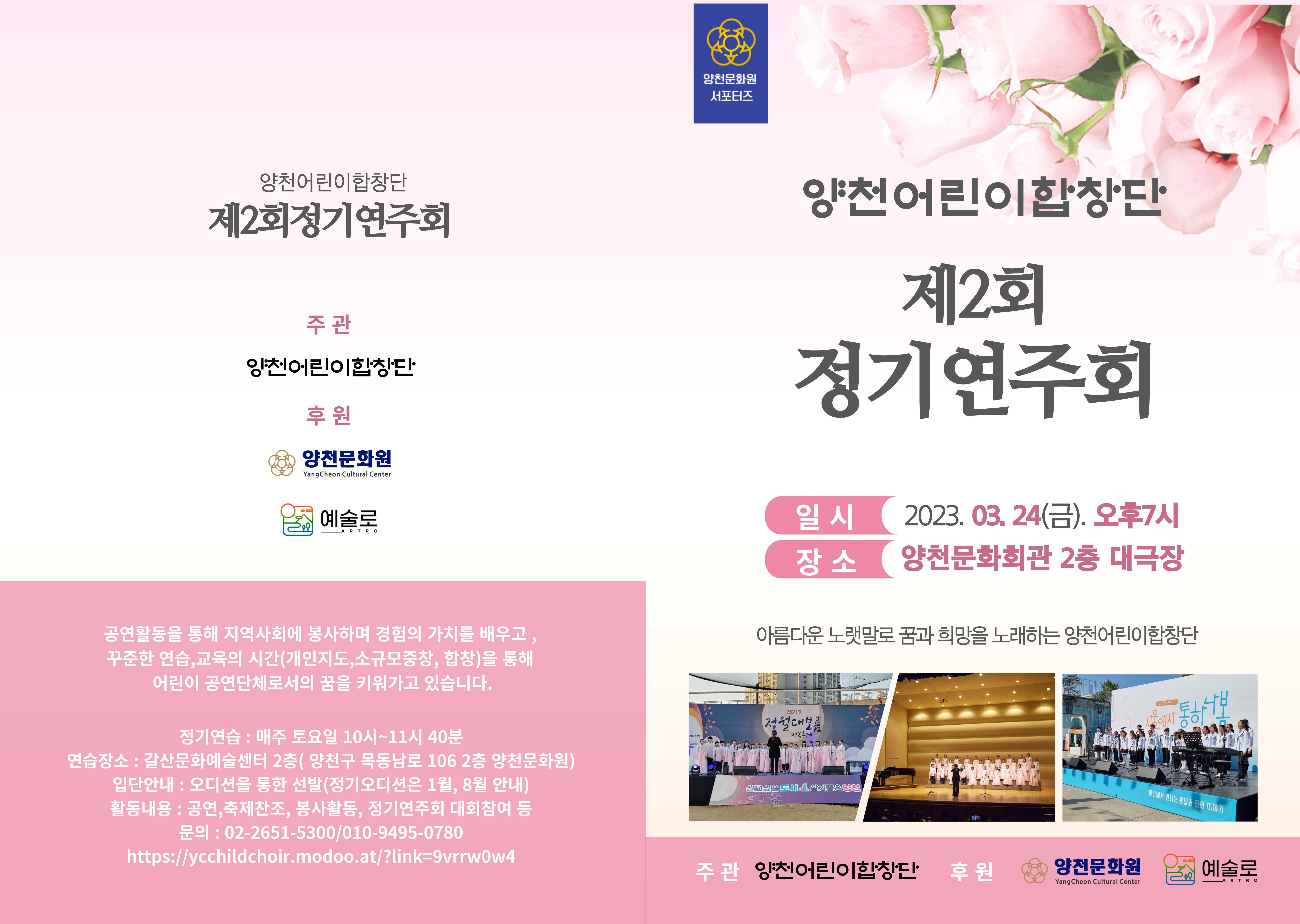 양천문화원 문화 서포터즈인 양천어린이합창단의 "제2회 정기연주회"가 오는 3월 24일(금) 오후7시, 양천문화회관 대극장에서 개최됩니다. <전좌석 선착순 무료관람>이며 우리 어린이들이 1년동안 열심히 연습한 곡들로 무대를 가득 채울 예정이오니 많은 관심과 관람 바랍니다.