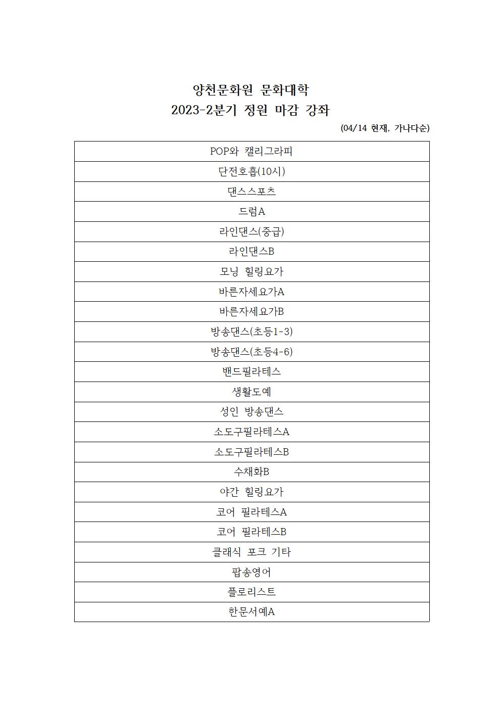 문화대학 2023-2분기 정원 마감 강좌(04.14 현재)