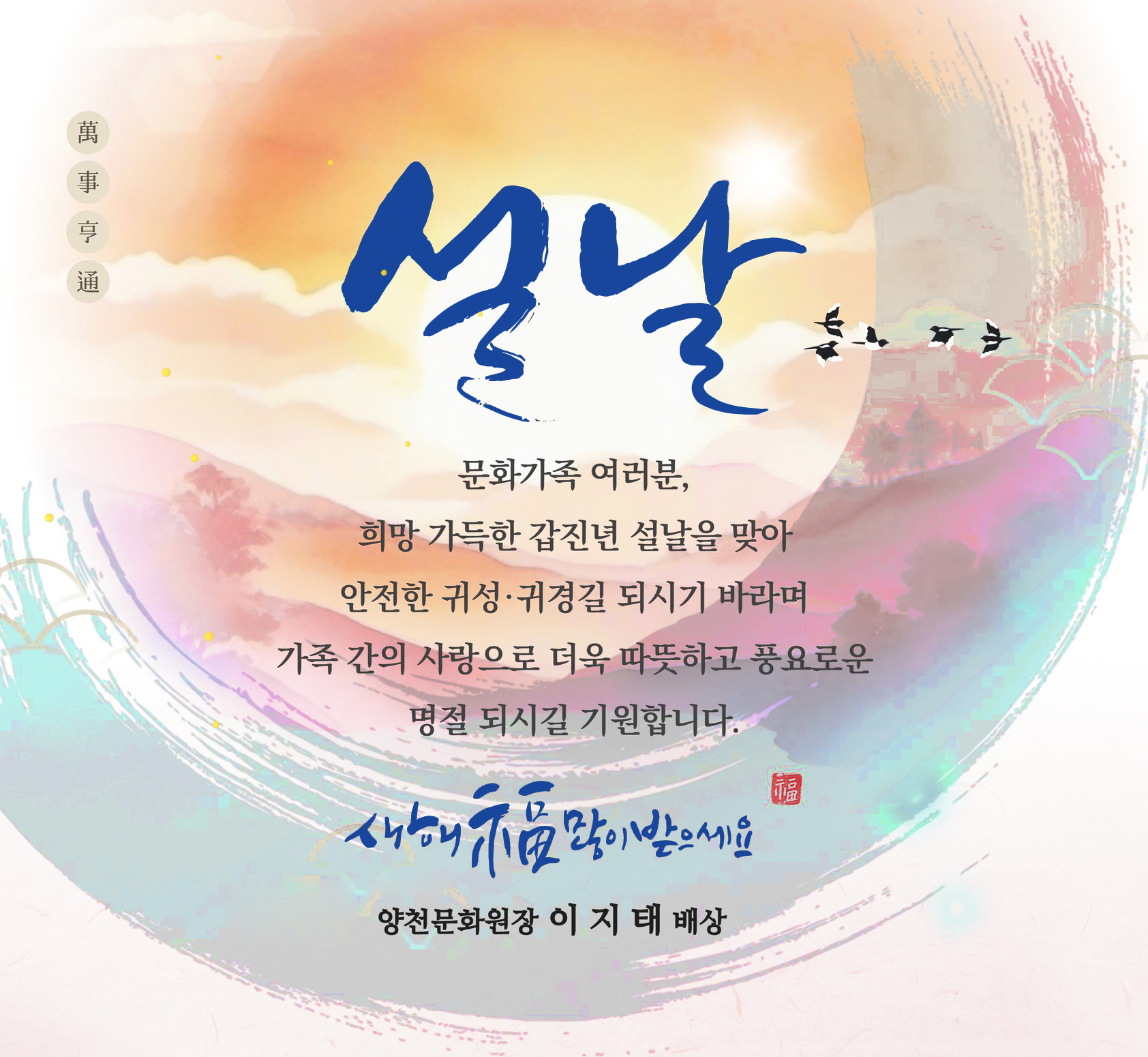 | 양천문화원 설 명절 2.9(금)~2.12(월) 휴관 안내 (0) | 2024.01.30 |