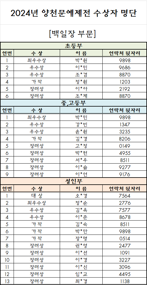 『2024 양천문예제전』 백일장, 사생, 휘호 부문 수상자를 발표합니다.