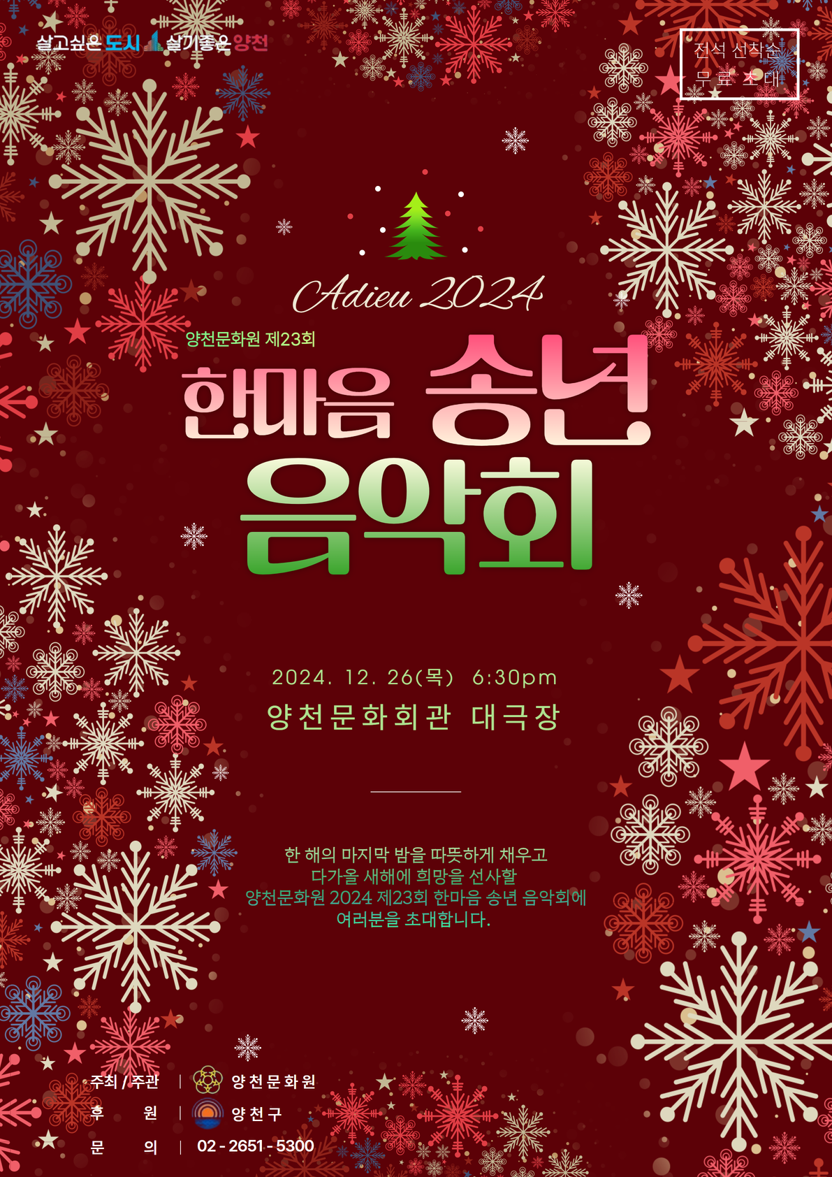 한 해의 마지막 밤을 따뜻하게 채우고 다가올 새해에 희망을 선사할 양천문화원 2024 제23회 한마음송년음악회에 여러분을 초대합니다.