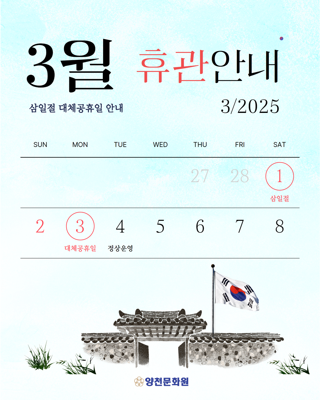 양천문화원은 3.1절 대체공휴일로 지정된 3월 3일(월) 휴관이며,