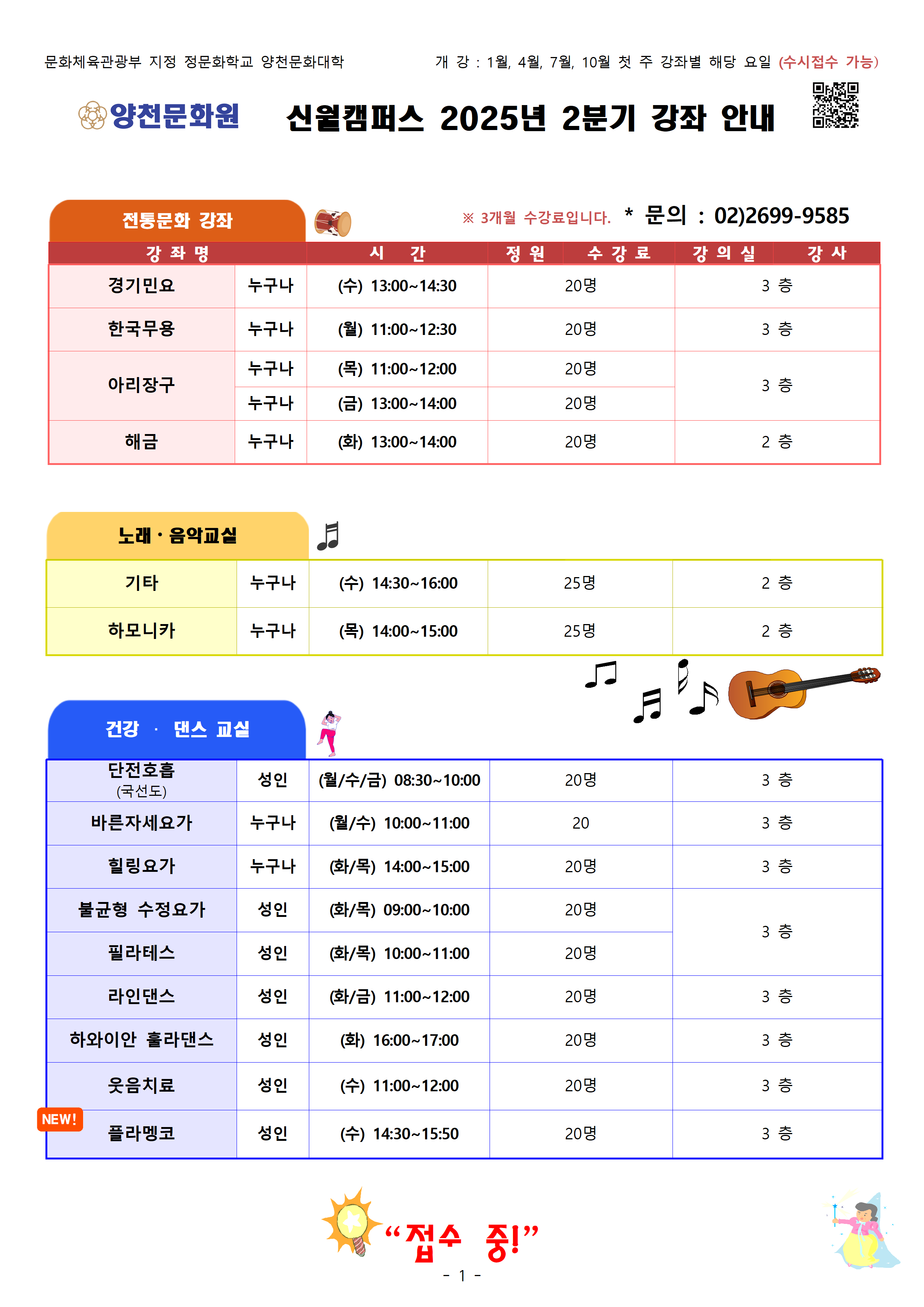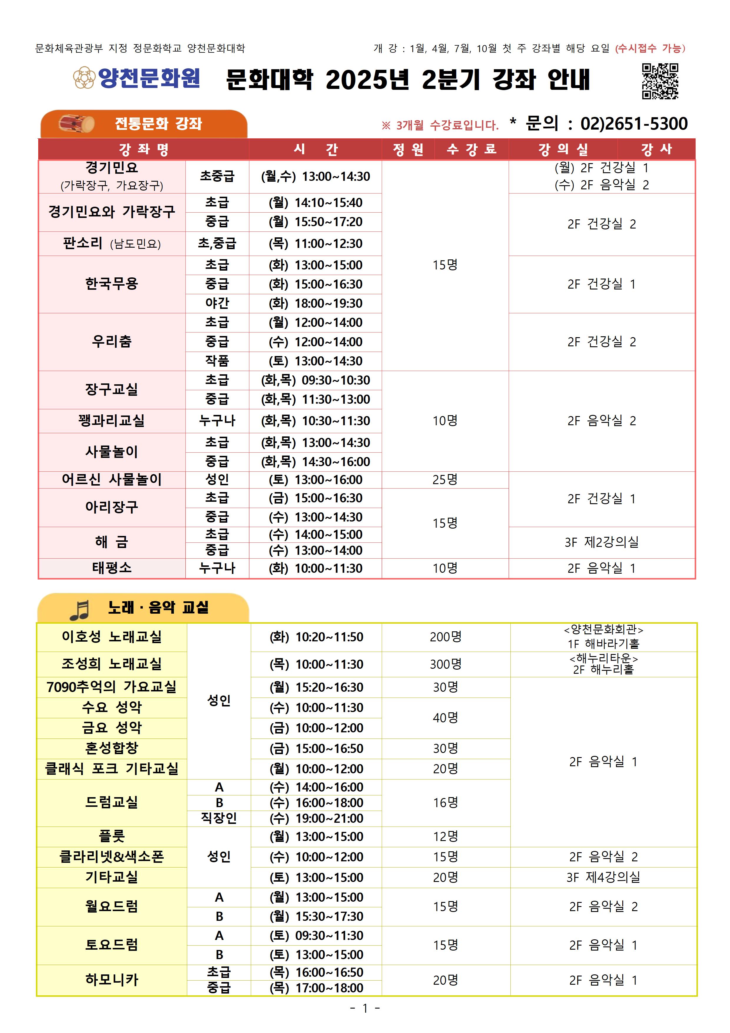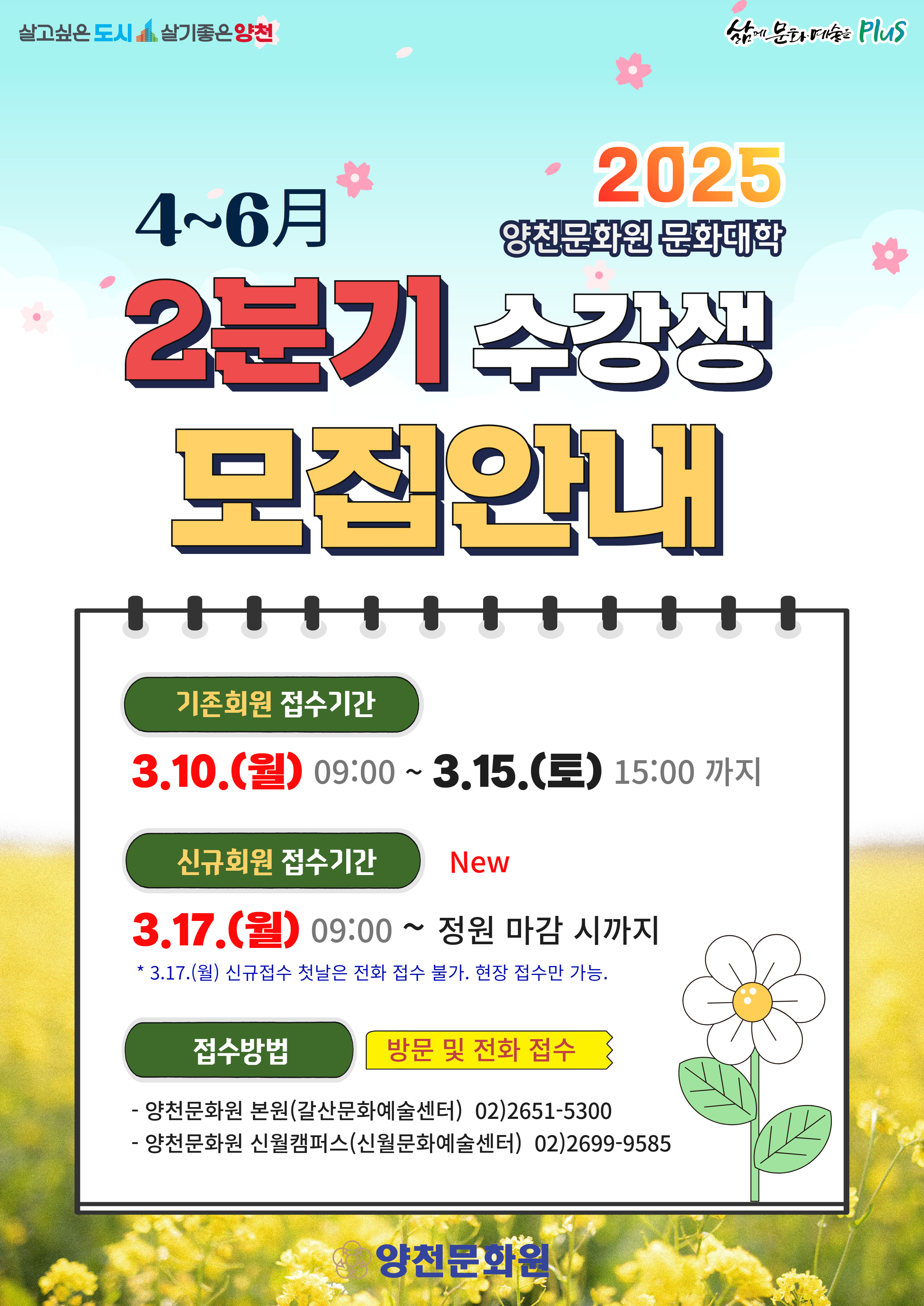 양천문화원 문화대학 2025년 2분기 접수일정을 안내드립니다.