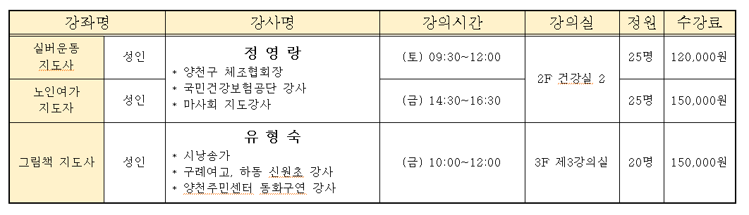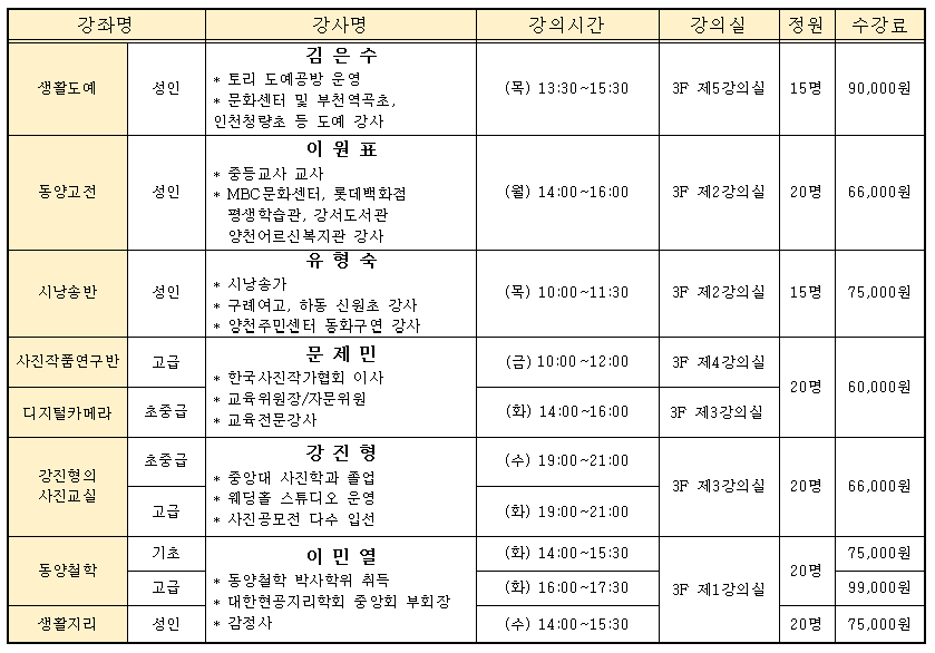 문화강좌 안내/강좌 정보 안내 교양, 취미, 자격 강좌 양천문화원 2019. 2. 21. 12:39 교양, 취미, 자격 강좌 ⊙ 개강 : 1월, 4월, 7월, 10월 첫 주 강좌별 해당 요일(수시접수 가능) ⊙ 강의 시간은 상황에 따라 변경될 수 있습니다. ⊙ 수강신청, 접수 및 안내 : 양천문화원 tel. 02)2651-5300 ⊙ 수강료 : 3개월 단위/재료비 별도 공유하기 게시글 관리 양천문화원 '문화강좌 안내 > 강좌 정보 안내' 카테고리의 다른 글 성인,어학교실 (0) 2019.03.29 전통문화강좌 (0) 2019.02.21 성인미술교실 (0) 2019.02.21 노래 음악 교실 (0) 2019.02.21 건강, 댄스교실 (0) 2019.02.21 '문화강좌 안내/강좌 정보 안내' Related Articles 성인,어학교실 전통문화강좌 성인미술교실 노래 음악 교실