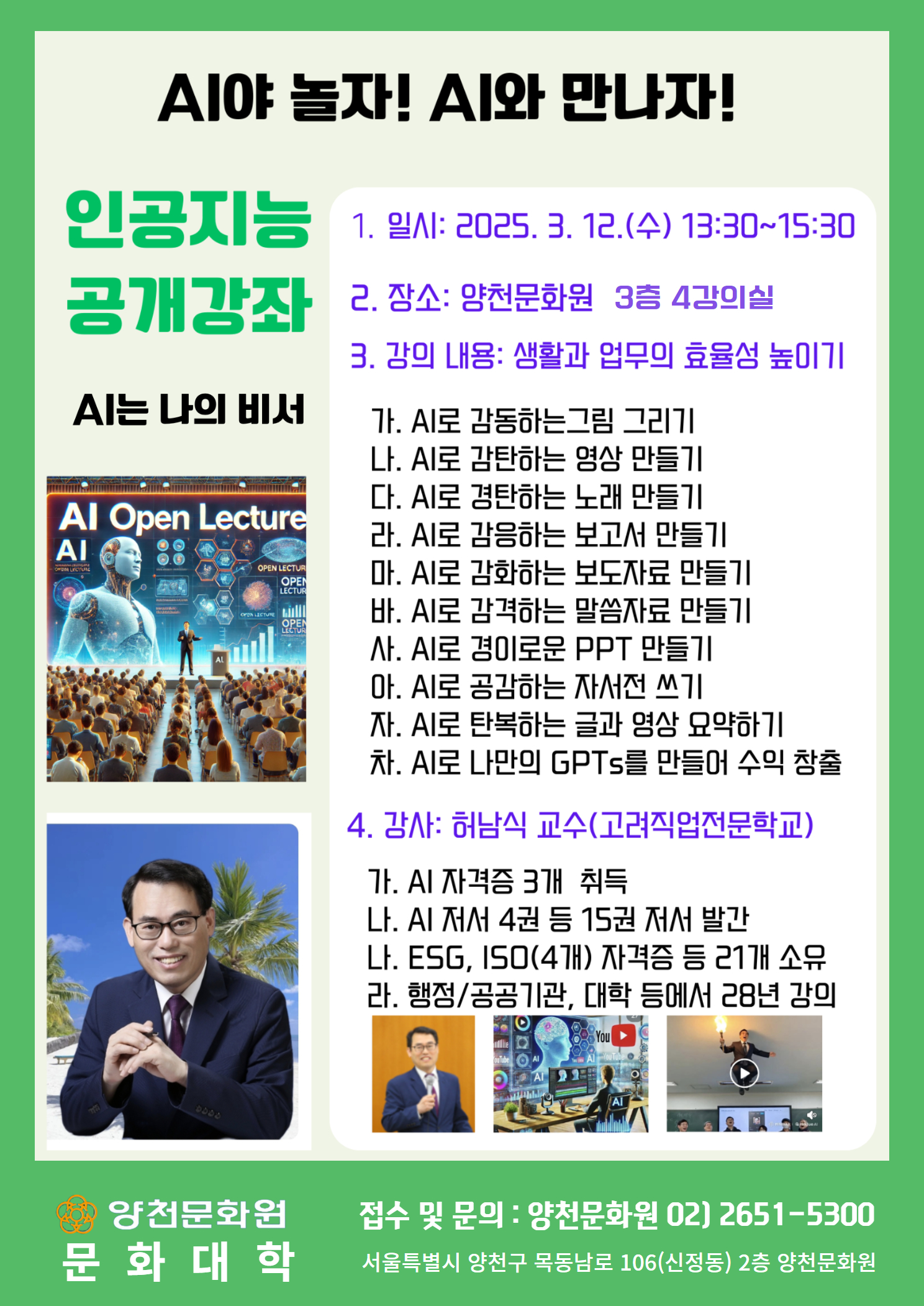 양천문화원에서 3월 12일(수) 13:30부터 "AI야 놀자! AI와 만나자!"라는 주제로 무료 공개강좌를 진행합니다.