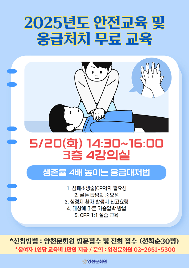 양천문화원에서는 생명 안전을 위한 「2025년도 안전교육 및 응급처치 무료 교육」을 실시합니다.