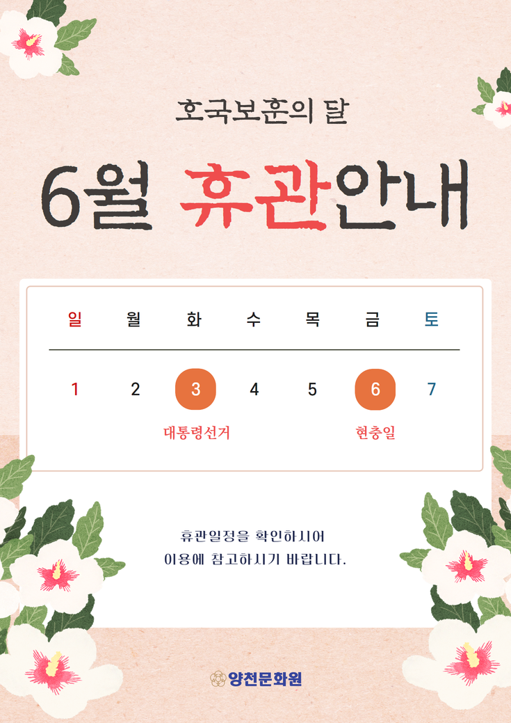 #양천문화원 #6월 #휴관안내 #선거 #현충일 #호국보훈의달