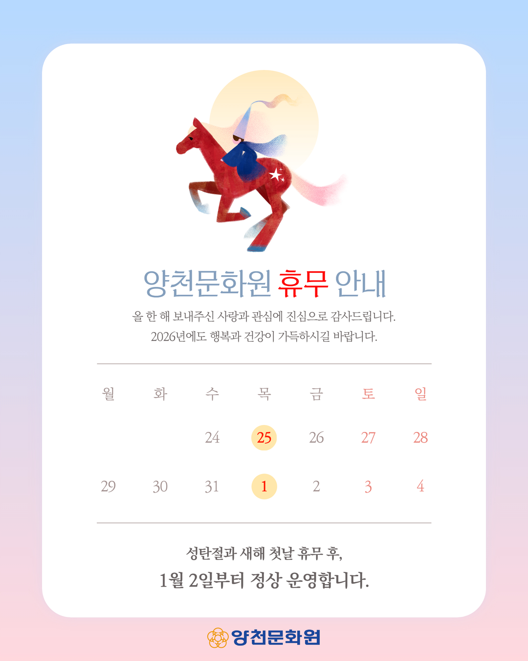 양천문화원 12,1월 휴무 일정을 안내드리오니 이용에 참고하시기 바랍니다.