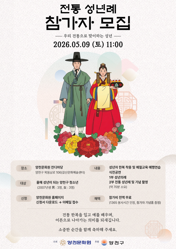 한복을 입고 예를 배우며 어른으로 나아가는 뜻깊은 시간을 함께할 전통 성년례 참가자를 모집합니다.